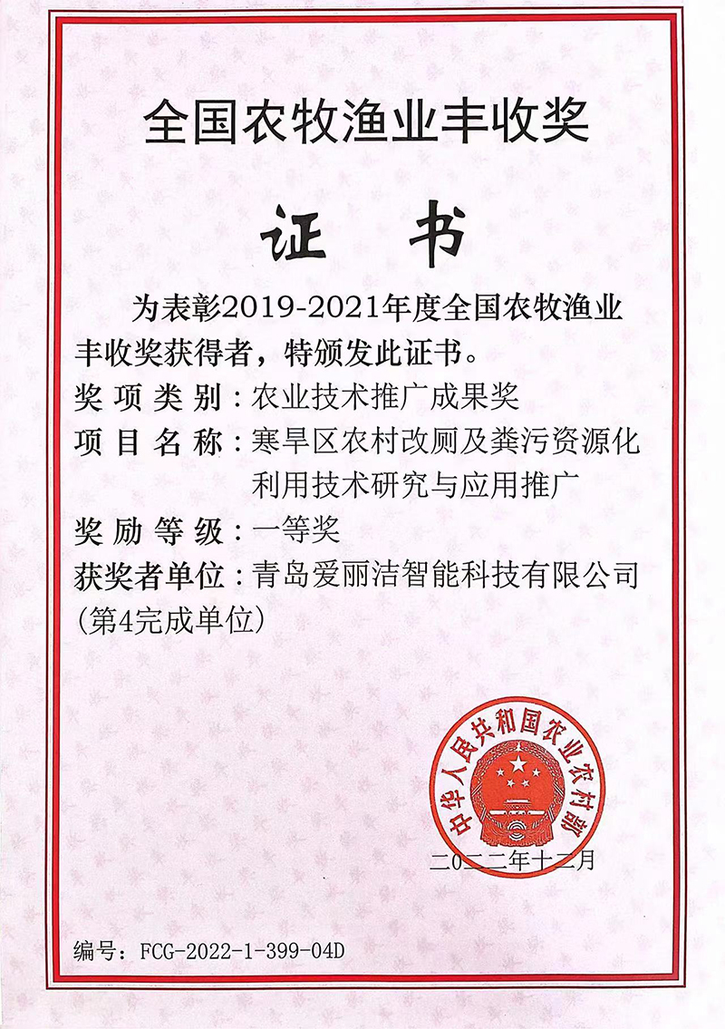 全國農牧漁業(yè)豐收獎(以下簡(jiǎn)稱(chēng)豐收獎)是中華人民共和國農業(yè)部于1987年設立的農業(yè)技術(shù)推廣獎,用于獎勵在農業(yè)技術(shù)推廣活動(dòng)中做出突出貢獻的集體和個(gè)人。豐收獎每三年開(kāi)展一次。該獎系農業(yè)部科技成果獎,由農業(yè)部科技教育司負責該獎的組織評審和日常管理工作。該獎面向全國農業(yè)系統,獎勵在農業(yè)技術(shù)推廣、成果轉化和產(chǎn)業(yè)化工作中作出突出成績(jì)的單位和個(gè)人。這一獎勵意味著(zhù)我公司的主要技術(shù)經(jīng)濟指標居國內領(lǐng)先水平。為我公司專(zhuān)利產(chǎn)品走向農村進(jìn)一步對接各地政府招標采購增加了積分和信心。